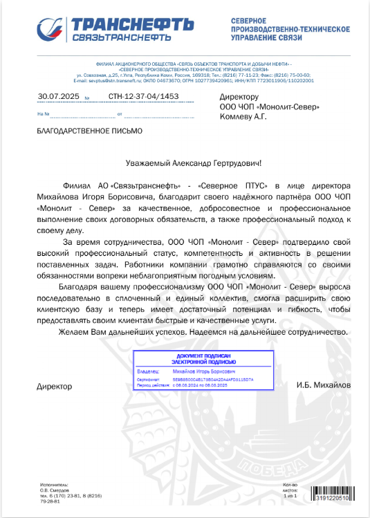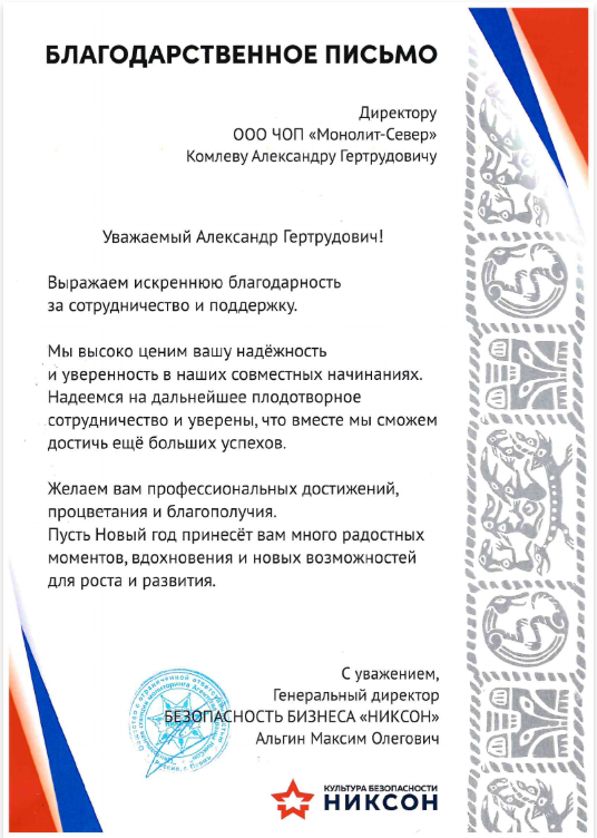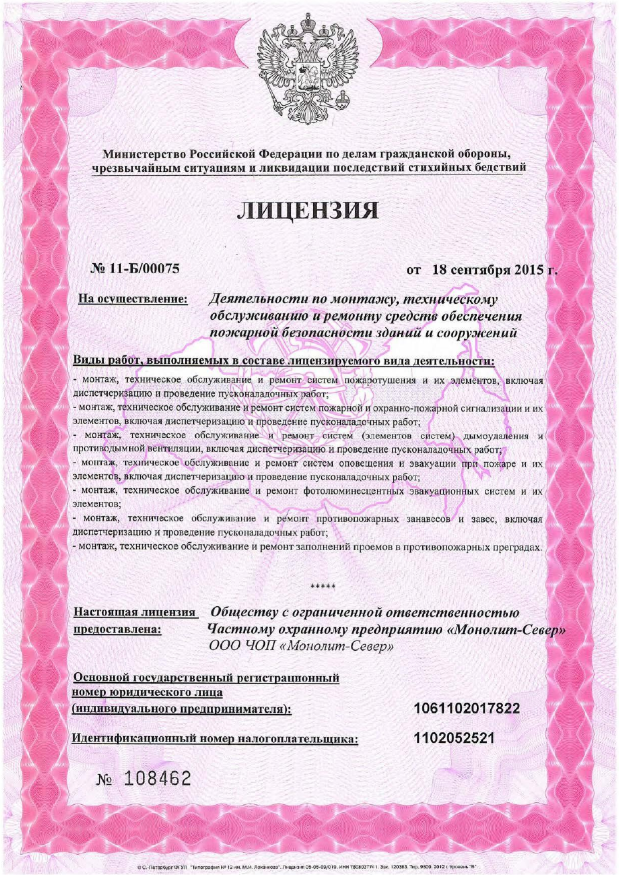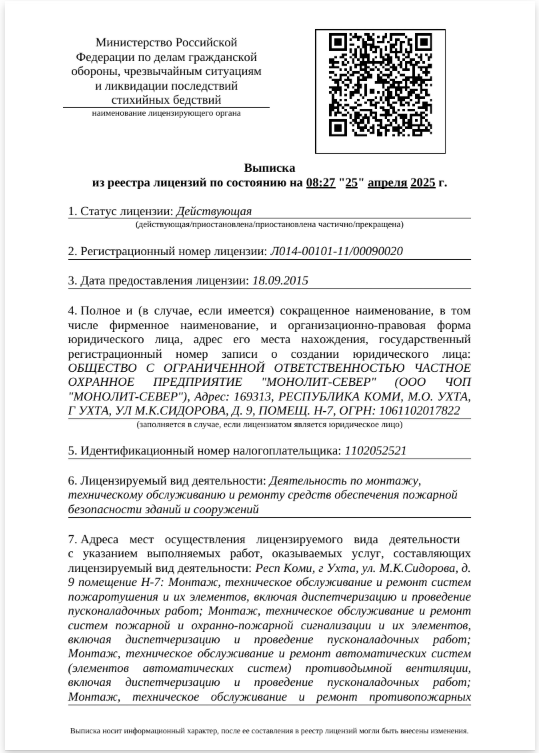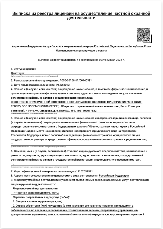 ООО Частное охранное предприятие «Монолит-Север» было создано в 2006 году, входит в состав группы компаний безопасности «МОНОЛИТ» и за период работы завоевало прочное положение на рынке охранных услуг Республики Коми. На сегодняшний день ЧОП «Монолит-Север» обладает всеми необходимыми финансовыми, кадровыми и материально-техническими ресурсами для предоставления качественных охранных услуг, соответствующих запросам заказчиков и является лидером среди охранных предприятий Республики Коми.